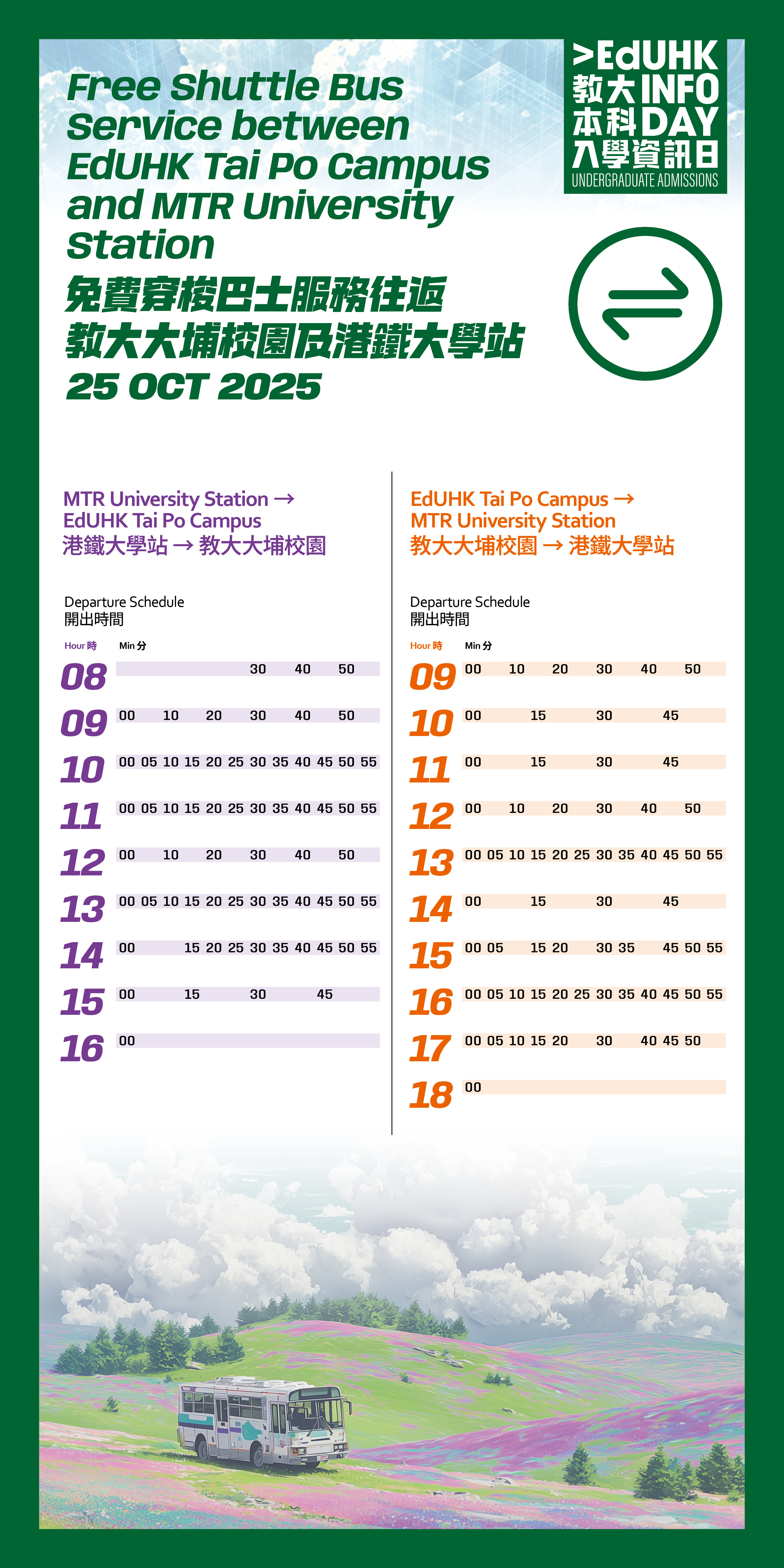 Come and join EdUHK Info Day on 25 October 2025 to explore our diverse undergraduate programmes, obtain the latest admissions tips and experience our vibrant campus life through various interactive activities. Live broadcasts will be available for part of the activities.
